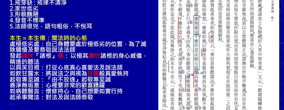 復次應如菩薩地說.須以五想聽聞正法。...... 如本生中亦云.「處極低劣座.發起調伏德.以具笑目視.如飲甘露雨.起敬專至誠.善淨無垢意.如病聽醫言.起承事聞法。」 P16L3~LL1