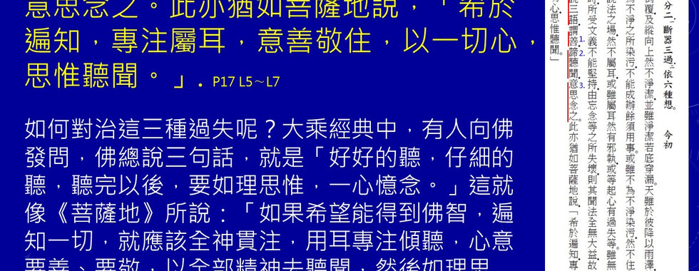 若器倒覆.及縱向上然不淨潔.......「希於遍知.專注屬耳.意善敬住.以一切心.思惟聽聞。」 P17L1~L7