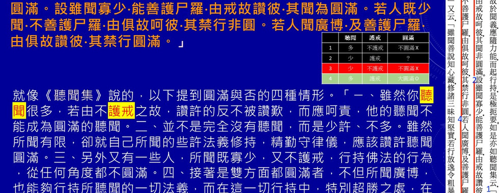 就像《聽聞集》說的,以下提到圓滿與否的四種情形。「ㄧ、雖然你聽聞很多,若由不護戒之故,讚許的反不被讚歎,而應呵責,他的聽聞不能成為圓滿的聽聞。二、並不是完全沒有聽聞,而是少許、不多。雖然所聞有限,卻就自己所聞的些許法義修持,精勤守律儀,應該讚許聽聞圓滿。三、另外又有一些人,所聞既寡少,又不護戒,行持佛法的行為,從任何角度都不圓滿。四、接著是雙方面都圓滿者,不但所聞廣博,也能夠行持所聽聞的一切法義,而在這一切行持中,特別超勝之處,在於能夠善加守護所承許受持的戒律,這是根本。由於這兩個原因,不僅值得讚歎,那人修法的一切禁行、行持,就任何層面而言都是圓滿的。