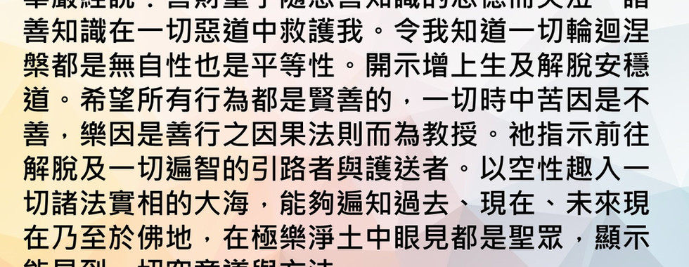 又如華嚴經云.「我此知識說正法.普示一切法功德.遍示菩薩威儀道.專心思惟而來此。1)此是能生如我母.2)與德乳故如乳母.周遍長養菩提分.此諸善識遮無利。3)解脫老死如醫王.4)如天帝釋降甘雨.5)增廣白法如滿月.6)猶日光明示靜品。7)對於怨親如山王.8)心無擾亂猶大海.9)等同船師遍救護.善財是思而來此。菩薩啟發我覺慧.佛子能生大菩提.我諸知識佛所讚.由是善心而來此。10)救護世間如勇士.11)是大商主及怙依.12)此給我樂如眼目.以此心事善知識。」應咏其頌而憶念之.易其善財而誦自名。